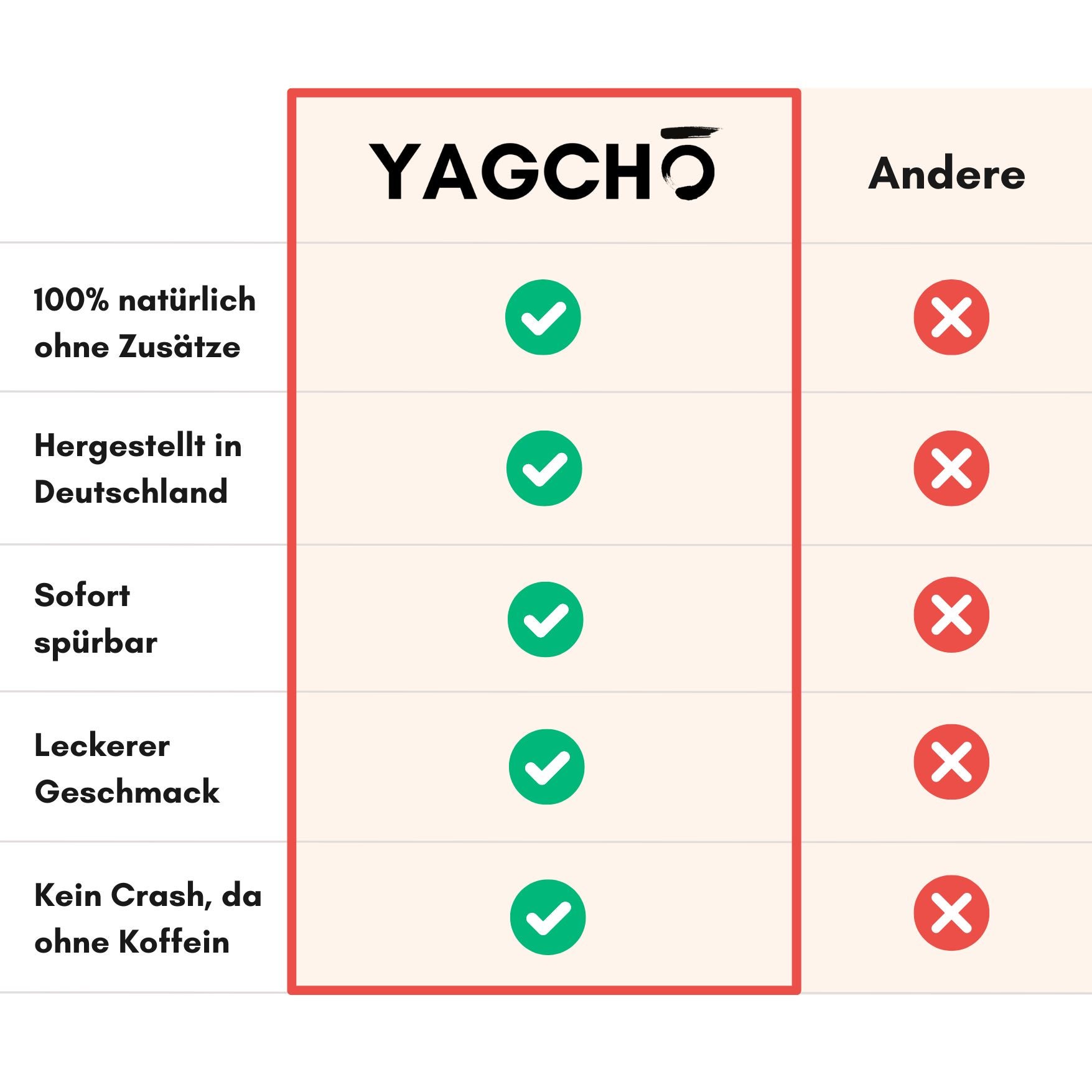 Wir wissen, wie wichtig dir wirksame, sowie 100% reine Produkte sind. Deshalb ist Yagcho auch 15x stärker konzentriert als andere Produkte. Was uns sonst von Anderen unterscheidet?